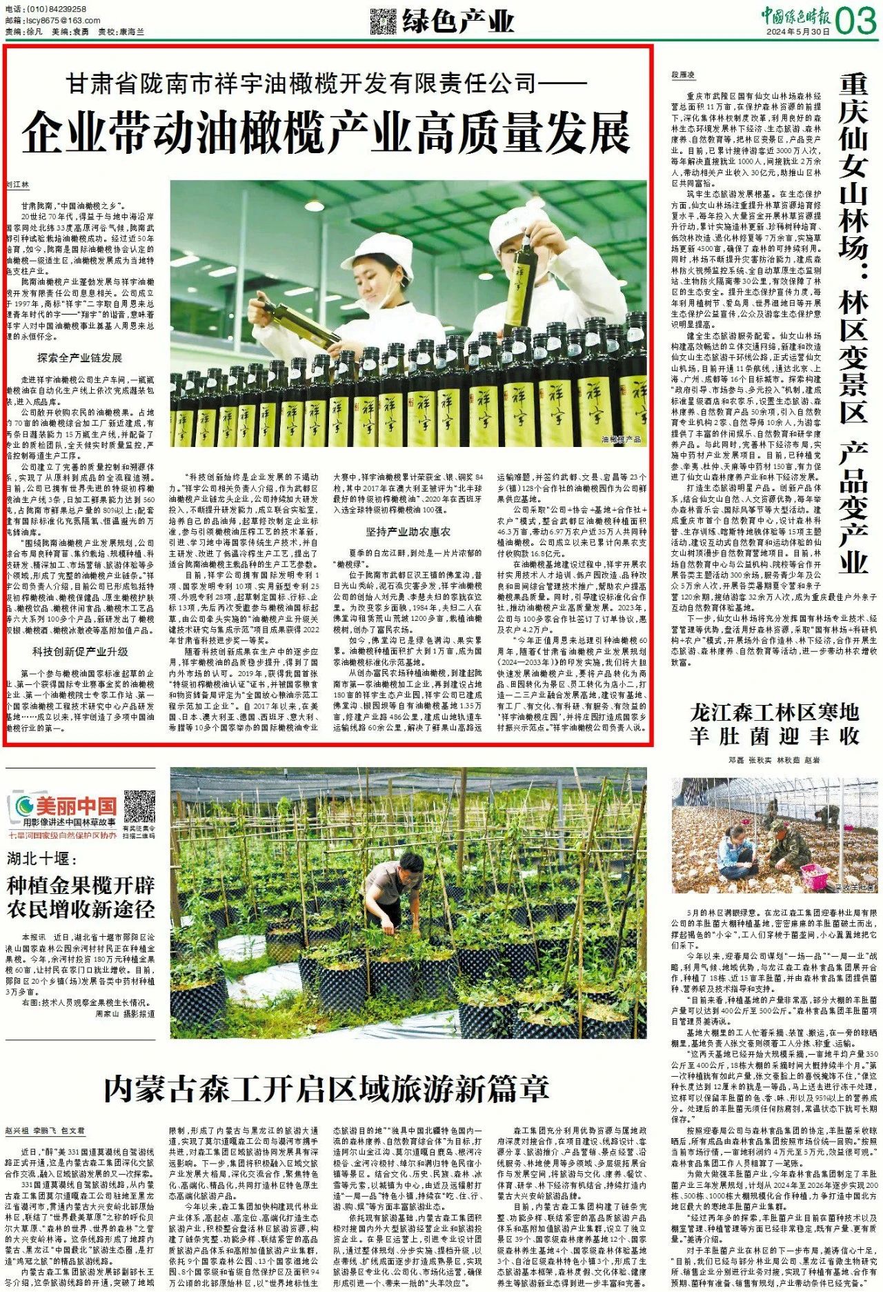 甘肅隴南,“中國油橄欖之鄉(xiāng)”。20世紀70年代,得益于與地中海沿岸國家同處北緯33度高原河谷氣候,隴南武都引種試驗栽培油橄欖成功。經(jīng)過近50年培育,如今,隴南是國際油橄欖協(xié)會認定的油橄欖一級適生區(qū),油橄欖發(fā)展成為當?shù)靥厣еa(chǎn)業(yè)。隴南油橄欖產(chǎn)業(yè)蓬勃發(fā)展與祥宇油橄欖開發(fā)有限責任公司息息相關。公司成立于1997年,商標“祥宇”二字取自周恩來總理青年時代的字——“翔宇”的諧音,意味著祥宇人對中國油橄欖事業(yè)奠基人周恩來總理的永恒懷念。探索全產(chǎn)業(yè)鏈發(fā)展走進祥宇油橄欖公司生產(chǎn)車間,一瓶瓶橄欖油在自動化生產(chǎn)線上依次完成灌裝包裝,進入成品庫。公司敞開收購農(nóng)民的油橄欖果。占地約70畝的油橄欖綜合加工廠新近建成,有兩條日灌裝能力15萬瓶生產(chǎn)線,并配備了專業(yè)的質檢團隊,全天候實時質量監(jiān)控,嚴格控制每道生產(chǎn)工序。公司建立了完善的質量控制和溯源體系,實現(xiàn)了從原料到成品的全流程追溯。目前,公司已擁有世界先進的特級初榨橄欖油生產(chǎn)線3條,日加工鮮果能力達到560噸,占隴南市鮮果總產(chǎn)量的80%以上;配套建有國際標準化充氮隔氧、恒溫避光的萬噸儲油庫?!皣@隴南油橄欖產(chǎn)業(yè)發(fā)展規(guī)劃,公司綜合布局良種育苗、集約栽培、規(guī)模種植、科技研發(fā)、精深加工、市場營銷、旅游體驗等多個領域,形成了完整的油橄欖產(chǎn)業(yè)鏈條?!毕橛罟矩撠熑私榻B,目前公司已形成包括特級初榨橄欖油、橄欖保健品、原生橄欖護膚品、橄欖飲品、橄欖休閑食品、橄欖木工藝品等六大系列100多個產(chǎn)品,新研發(fā)出了橄欖雙椒、橄欖酒、橄欖冰激凌等高附加值產(chǎn)品??萍紕?chuàng)新促產(chǎn)業(yè)升級第一個參與橄欖油國家標準起草的企業(yè)、第一個獲得國際專業(yè)賽事金獎的油橄欖企業(yè)、第一個油橄欖院士專家工作站、第一個國家油橄欖工程技術研究中心產(chǎn)品研發(fā)基地……成立以來,祥宇創(chuàng)造了多項中國油橄欖行業(yè)的第一?!翱萍紕?chuàng)新始終是企業(yè)發(fā)展的不竭動力?!毕橛罟鞠嚓P負責人介紹,作為武都區(qū)油橄欖產(chǎn)業(yè)鏈龍頭企業(yè),公司持續(xù)加大研發(fā)投入,不斷提升研發(fā)能力,成立聯(lián)合實驗室,培養(yǎng)自己的品油師,起草修改制定企業(yè)標準,參與引領橄欖油壓榨工藝的技術革新,引進、學習地中海國家傳統(tǒng)生產(chǎn)技術,并自主研發(fā)、改進了低溫冷榨生產(chǎn)工藝,提出了適合隴南油橄欖主栽品種的生產(chǎn)工藝參數(shù)。目前,祥宇公司擁有國際發(fā)明專利1項、國家發(fā)明專利10項、實用新型專利25項、外觀專利28項,起草制定國標、行標、企標13項,先后兩次受邀參與橄欖油國標起草,由公司牽頭實施的“油橄欖產(chǎn)業(yè)升級關鍵技術研究與集成示范”項目成果獲得2022年甘肅省科技進步獎一等獎。隨著科技創(chuàng)新成果在生產(chǎn)中的逐步應用,祥宇橄欖油的品質穩(wěn)步提升,得到了國內(nèi)外市場的認可。2019年,獲得我國首張“特級初榨橄欖油認證”證書,并被國家糧食和物資儲備局評定為“全國放心糧油示范工程示范加工企業(yè)”。自2017年以來,在美國、日本、澳大利亞、德國、西班牙、意大利、希臘等10多個國家舉辦的國際橄欖油專業(yè)大賽中,祥宇油橄欖累計榮獲金、銀、銅獎84枚,其中2017年在澳大利亞被評為“北半球最好的特級初榨橄欖油”、2020年在西班牙入選全球特級初榨橄欖油100強。堅持產(chǎn)業(yè)助農(nóng)惠農(nóng)夏季的白龍江畔,到處是一片片濃郁的“橄欖綠”。位于隴南市武都區(qū)漢王鎮(zhèn)的佛堂溝,昔日光山禿嶺,泥石流災害多發(fā),祥宇油橄欖公司的創(chuàng)始人劉元勇、李慧夫婦的家就在這里。為改變家鄉(xiāng)面貌,1984年,夫婦二人在佛堂溝租賃荒山荒坡1200多畝,栽植油橄欖樹,創(chuàng)辦了富民農(nóng)場。如今,佛堂溝已是綠色滿溝、果實累累。油橄欖種植面積擴大到1萬畝,成為國家油橄欖標準化示范基地。從創(chuàng)辦富民農(nóng)場種植油橄欖,到建起隴南市第一家油橄欖加工企業(yè),再到建設占地180畝的祥宇生態(tài)產(chǎn)業(yè)園,祥宇公司已建成佛堂溝、椒園壩等自有油橄欖基地1.35萬畝,修建產(chǎn)業(yè)路486公里,建成山地軌道車運輸線路60余公里,解決了鮮果山高路遠運輸難題,并簽約武都、文縣、宕昌等23個鄉(xiāng)(鎮(zhèn))128個合作社的油橄欖園作為公司鮮果供應基地。公司采取“公司+協(xié)會+基地+合作社+農(nóng)戶”模式,整合武都區(qū)油橄欖種植面積46.3萬畝,帶動6.97萬農(nóng)戶近35萬人共同種植油橄欖。公司成立以來已累計向果農(nóng)支付收購款16.8億元。在油橄欖基地建設過程中,祥宇開展農(nóng)村實用技術人才培訓、低產(chǎn)園改造、品種改良和田間綜合管理技術推廣,幫助農(nóng)戶提高橄欖果品質量。同時,引導建設標準化合作社,推動油橄欖產(chǎn)業(yè)高質量發(fā)展。2023年,公司與100多家合作社簽訂了訂單協(xié)議,惠及農(nóng)戶4.2萬戶?!敖衲暾抵芏鱽砜偫硪N油橄欖60周年,隨著《甘肅省油橄欖產(chǎn)業(yè)發(fā)展規(guī)劃(2024—2033年)》的印發(fā)實施,我們將大膽快速發(fā)展油