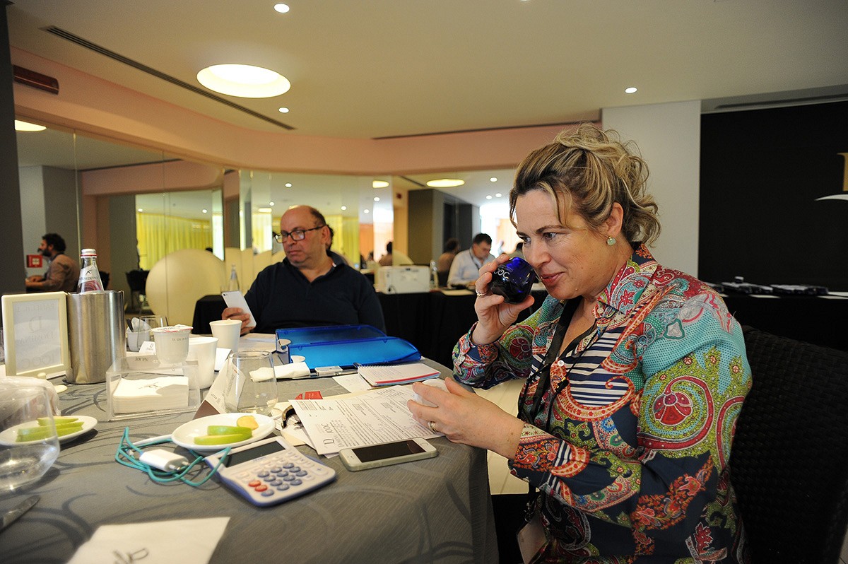 同一地點(diǎn)對特級初榨橄欖油進(jìn)行品鑒打分,品鑒過程競爭非常激烈,評委們也很專業(yè)、執(zhí)著、認(rèn)真。